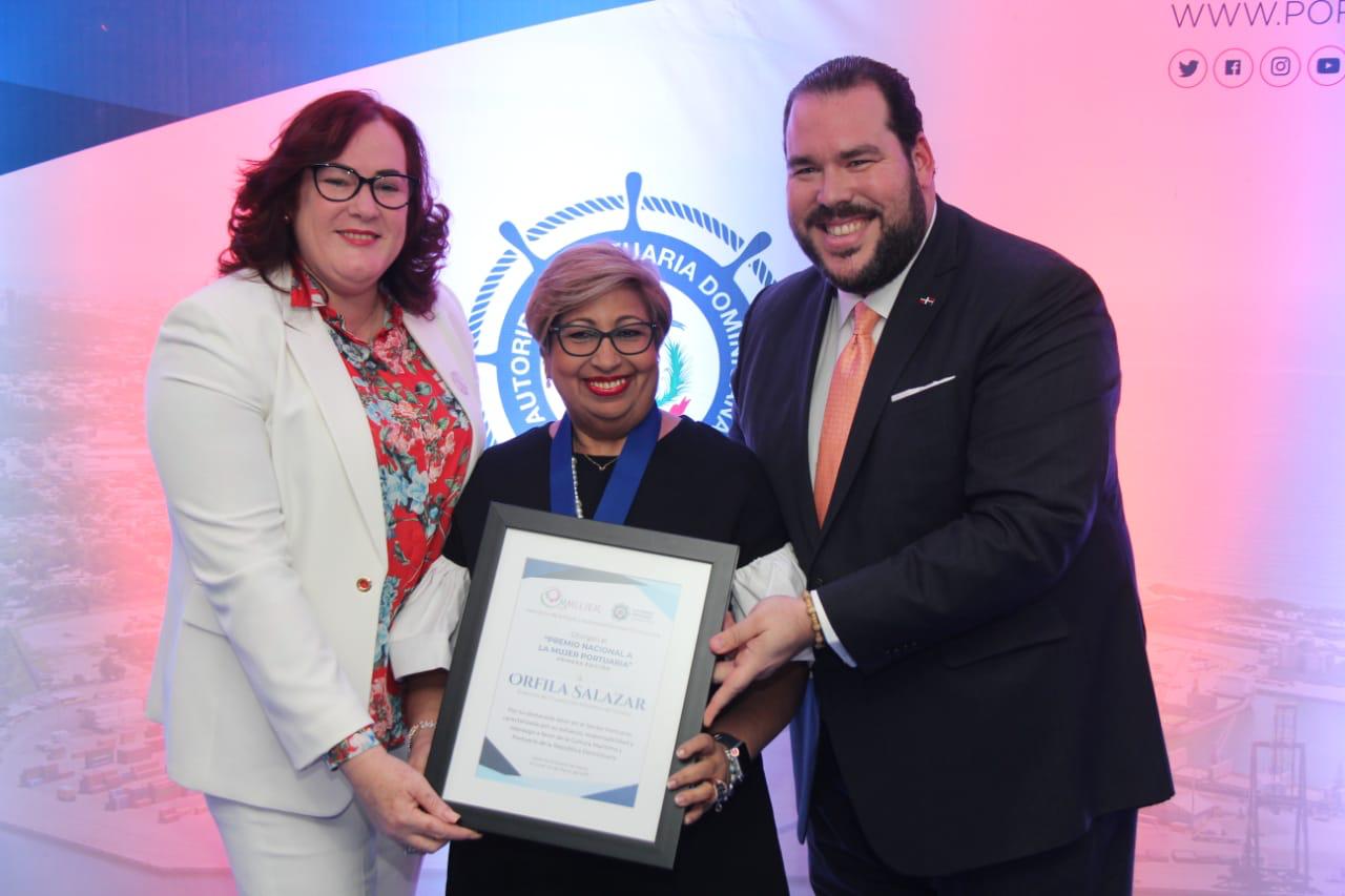 La distinción a Salazar fue hecha por Janet Camilo, ministra de la Mujer y Víctor Gómez Casanova, director Ejecutivo de Apordom, durante un concurrido y emotivo acto con motivo de la primera edición del Premio Nacional a la Mujer Portuaria en el que fueron reconocidas unas 28 prominentes representantes de la industria marítima y portuaria del país.