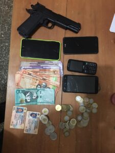 Fueron detenidos en la carretera Sosúa-Cabarete y tenían en su poder cuatro teléfonos celulares, una pistola plástica de juguete de color negra y la suma de RD$520 en moneda y mil trescientos cincuenta RD$1350 en billetes.