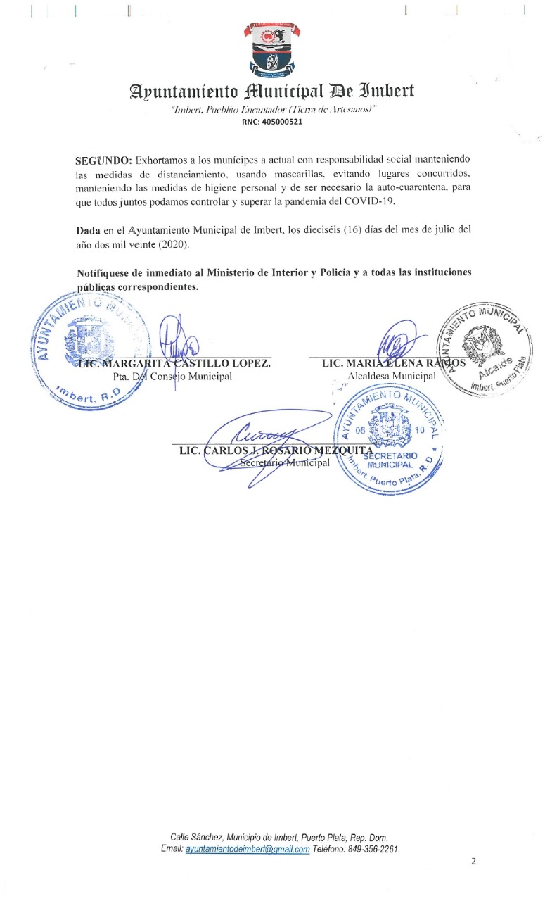 Un comunicado de Prensa remitido a este medio por el ayuntamiento de este municipio, indica que ese organismo emitió una ordenanza donde cierra de forma temporal el parque Profesor Juan Bosch de la entrada del municipio.