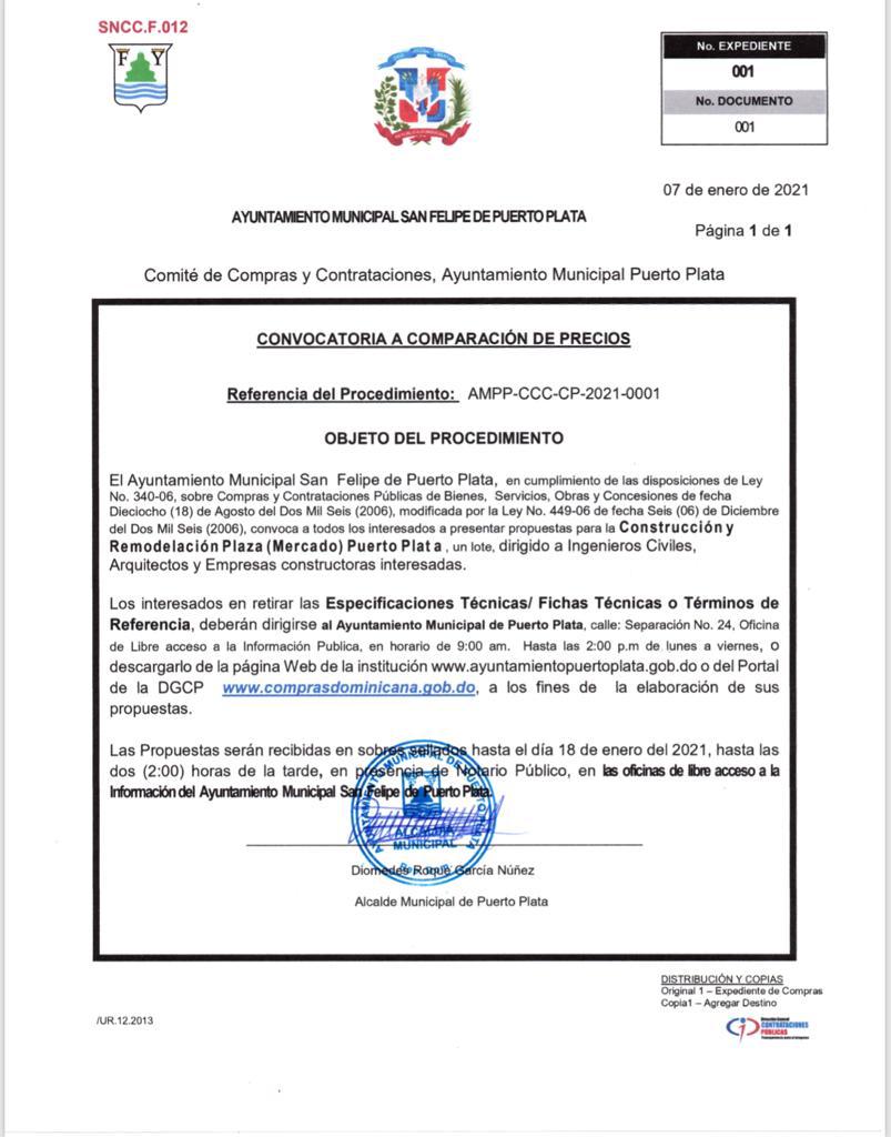 Mediante un comunicado de prensa, donde detalla que el Comité de Compras y Contrataciones Ayuntamiento del Municipal San Felipe de Puerto Plata convocan a todos los interesados a presentar propuestas para la construcción y remodelación plaza (Mercado) de esta ciudad.