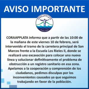 La Corporación del Acueducto y Alcantarillado de Puerto Plata, informó que a partir de hoy viernes desde la 10:00 de la mañana, será intervenido un tramo en la carretera principal de San Marcos de esta localidad, donde se instalara un tubería para solucionar el problema sanitario del lugar.