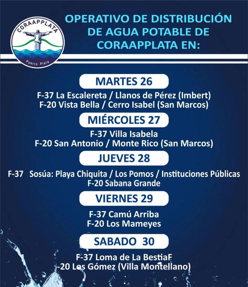 La Corporación del acueducto y Alcantarillado de Puerto Plata, informó sobre el inicio de un operativo de entrega de aguas en varias comunidades de esta provincia.