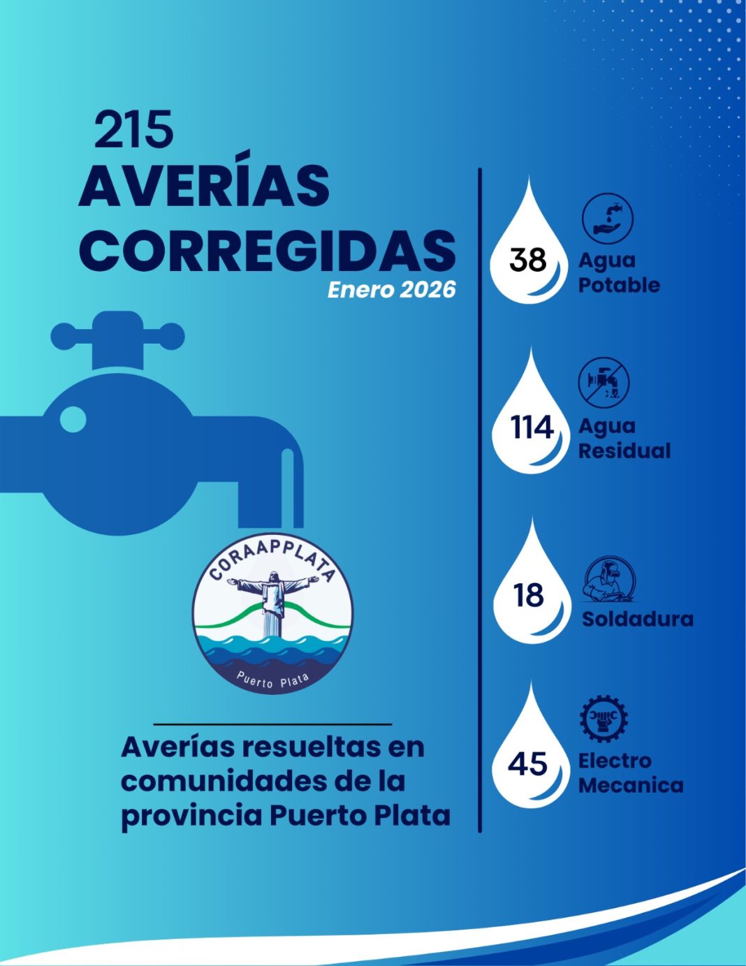 Puerto Plata.-En enero, brigadas de la Corporación de Acueductos y Alcantarillados de Puerto Plata (CORAAPPLATA) atendieron 215 incidencias en sectores y comunidades de la provincia.