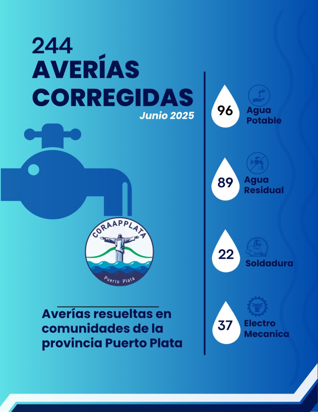 Puerto Plata.-Durante el mes de junio, las brigadas de la Corporación de Acueductos y Alcantarillados de Puerto Plata (CORAAPPLATA) solucionaron 244 averías en distintas comunidades y sectores de la provincia Puerto Plata.