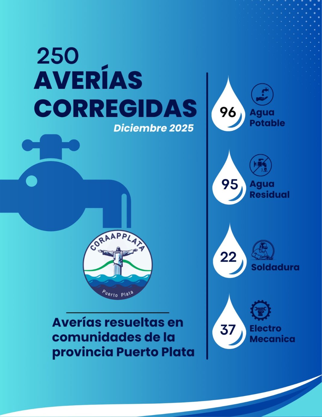PUERTO PLATA.-Durante el mes de diciembre, las brigadas de la Corporación de Acueductos y Alcantarillados de Puerto Plata (CORAAPPLATA) solucionaron un total de 250 averías en distintos sectores y comunidades de la provincia.