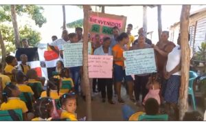 Los reclamantes, padres, madres, tutores y niños portando pancarta reclaman la construcción de un centro educativo ya que los estudiantes reciben docencia en una vieja enramada.