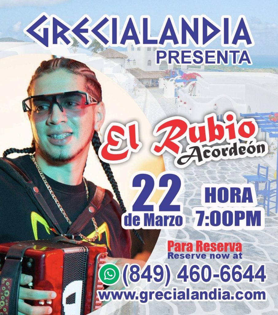 El nuevo fenómeno El Rubio Acordeón se presentará este sábado 22 de marzo a partir de las 6:00 de la tarde en el amplio y moderno pueblo griego, Grecialandia en una noche que promete ser espectacular.