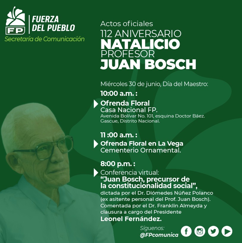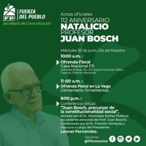 Finalmente se realizará la conferencia virtual titulada “Juan Bosch: precursor de la institucionalidad social”, impartida por el doctor Diómedes Núñez, ex asistente personal del fallecido líder y extraordinario escritor, a las 8:00 p.m. Dicho coloquio será comentado por el doctor Franklin Almeyda y tendrá los comentarios finales del expresidente Leonel Fernández.
