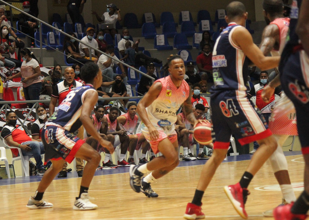 El norteamericano Jordan Williams conduce con 26 puntos los Sosúa Sharks 103-95 sobre los Correcaminos de la Parte Baja, en el cierre de las acciones del XXV TBSPOP2021 en el Techado Fabio Rafael González.