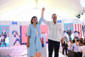 «Llevando la voz del cambio, todos juntos, todo el PRM con sus aliados, vamos a decirles, a ustedes (los opositores), ni vuelven ni van porque las reformas y el cambio siguen, va a seguir el gobierno honesto», expresó Abinader, quien estuvo acompañado de la dirigente del PRM, Raquel Peña y su esposa Raquel Arbaje.