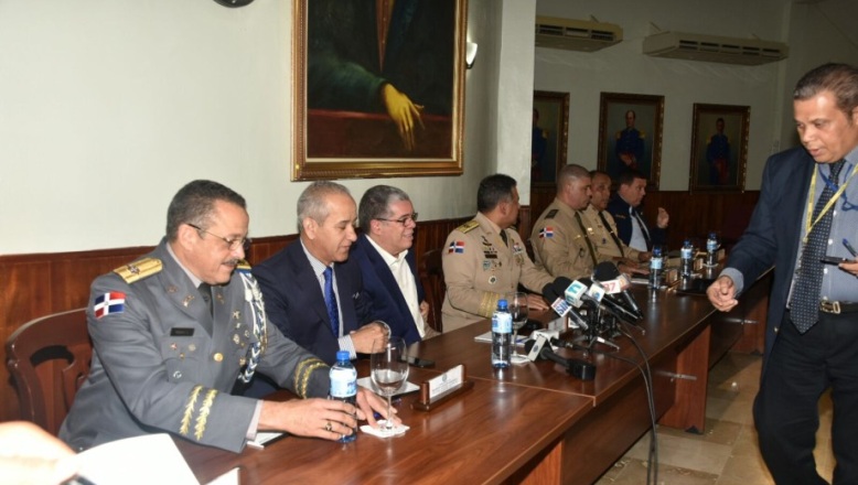 Participaron en la rueda de prensa Carlos Amarante Baret, ministro de Interior y Policía; Almirante Sigfrido Pared Pérez, director del Departamento Nacional de Investigaciones (DNI); y mayor general Braulio Alcántara López, Comandante General del Ejército de República Dominicana.