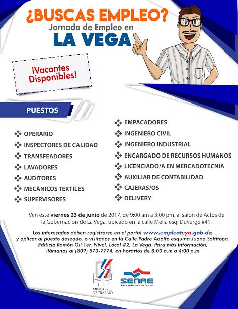 El Ministerio de Trabajo, a través del servicio Nacional de Empleo (SENAE), invita a las personas interesadas a participar en la Jornada de Empleo que se realizará este viernes 23 de junio, en la ciudad de La Vega.