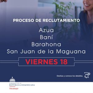 El Ministerio de Trabajo, invita a las personas interesadas a depositar su currículum para un proceso de reclutamiento que se realizará para una empresa del sector salud, el viernes 18 de diciembre del año en curso, en las provincias Azua, Baní, Barahona, y San Juan de la Maguana, las cuales se llevarán a cabo en horario de 9:00 a.m. a 2:00 p.m., para todas las provincias.