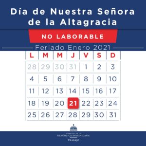 El Ministerio de Trabajo reitera a toda la colectividad empresarial y trabajadora del país que el “Día de la Altagracia”, festividad religiosa que se celebra el jueves 21 de enero, no se cambia.