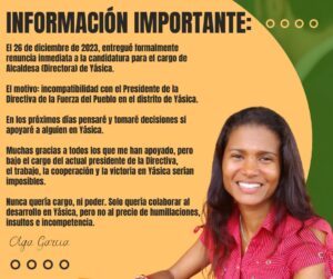 La aspirante de dirigir la Junta distrital de Yásica por el partido Fuerza del Pueblo, Olga García, renuncio a sus aspiraciones debido a supuesto mal entendido con la dirigencia de esa organización.