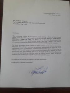 “Luego de un respetuoso saludos me dirijo a usted con la finalidad de presentar mi renuncia del Partido de la Liberación Dominicana, organización que es militado desde el año 1998 de donde participe activamente en el desarrollo político-democrático del distrito municipal de Cabarete”, dice la comunicación.