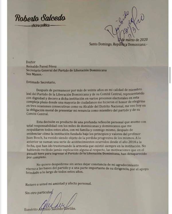 Salcedo expresó que durante más de veinte años representó con dignidad y decora a dicha institución en varios procesos electorales en esta compleja plaza donde una mayoría de ciudadanos me hicieron el honor de elegirme en tres ocasiones consecutivas como su alcalde del Distrito Nacional, me veo hoy en la obligación moral de representar mi renuncia como miembro del partido.
