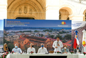 El presidente Luis Abinader y el ministro de Turismo, David Collado, encabezaron la firma de un acuerdo entre el MITUR y más de seis instituciones del Estado y del sector privado para la ejecución del Programa Integral de Desarrollo Turístico y Urbano de la Ciudad Colonial de Santo Domingo, con una inversión de 90 millones de dólares, a través de un financiamiento del Banco Interamericano de Desarrollo (BID).