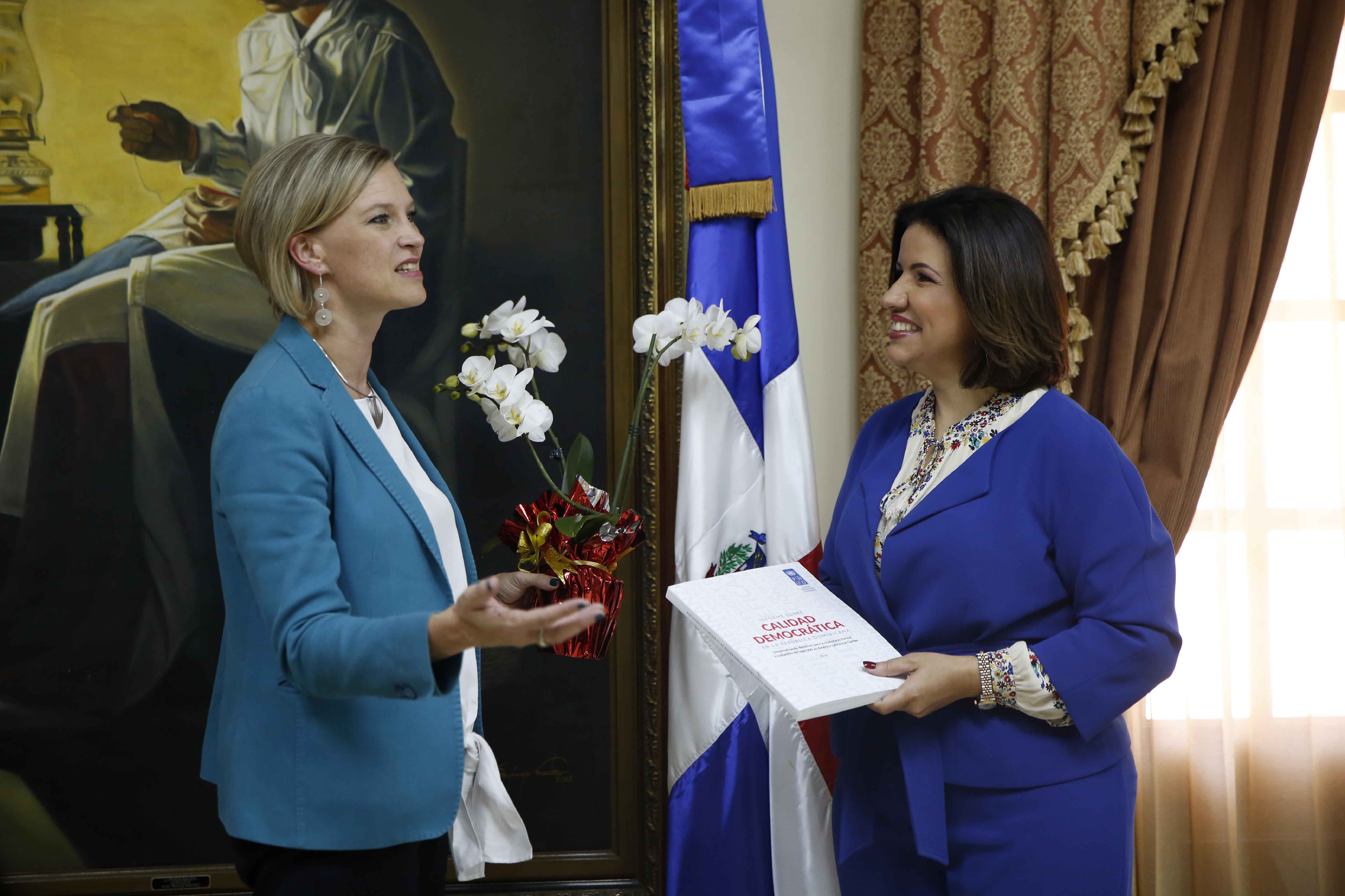 La vicepresidenta Margarita Cedeño recibió en el salón Los Trinitarios del Palacio Nacional a la nueva representante en el país del Programa de las Naciones Unidas para el Desarrollo (PNUD), Inka Mattila, de quien recibió el reciente Informe de Calidad Democrática de ese organismo internacional.
